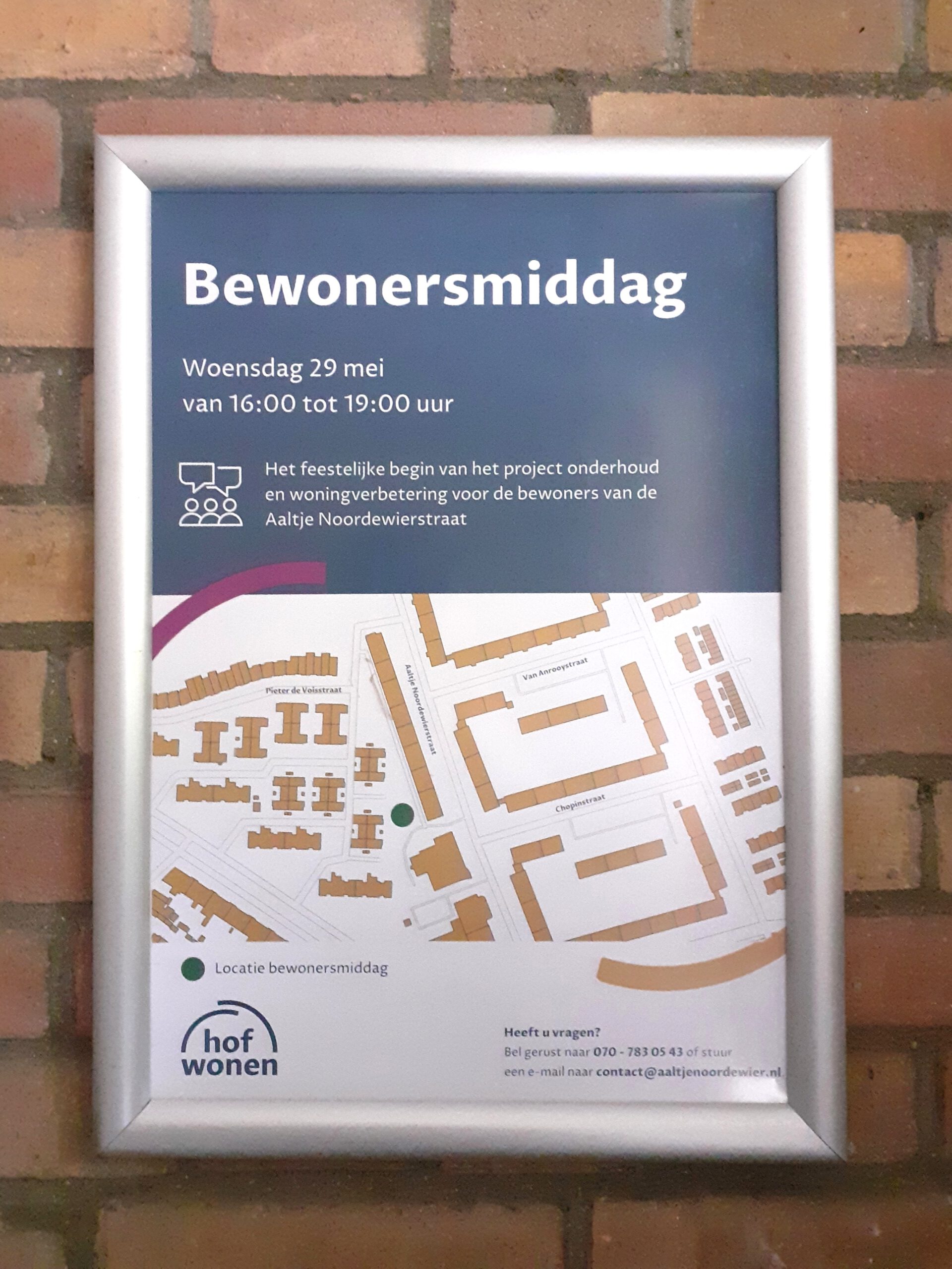 Bouwstenen zijn de grote aanpakken. Maar een goed project bestaat ook uit de kleine dingen. Het kaartje dat op het juiste moment in de bus valt. De poster in het portiek die iemand doet stoppen en lezen. Het mokje met de projectnaam dat op het aanrecht blijft staan. Zandkorrels, elk op zich onzichtbaar klein, maar samen maken ze strand (het Haagse stand dan ;-)). Wij hebben een heel arsenaal aan communicatiemiddelen en events ontwikkeld die we inzetten wanneer het past. Niet als standaardpakket, maar als gereedschapskist. Per project, per buurt, per moment kiezen we wat werkt.