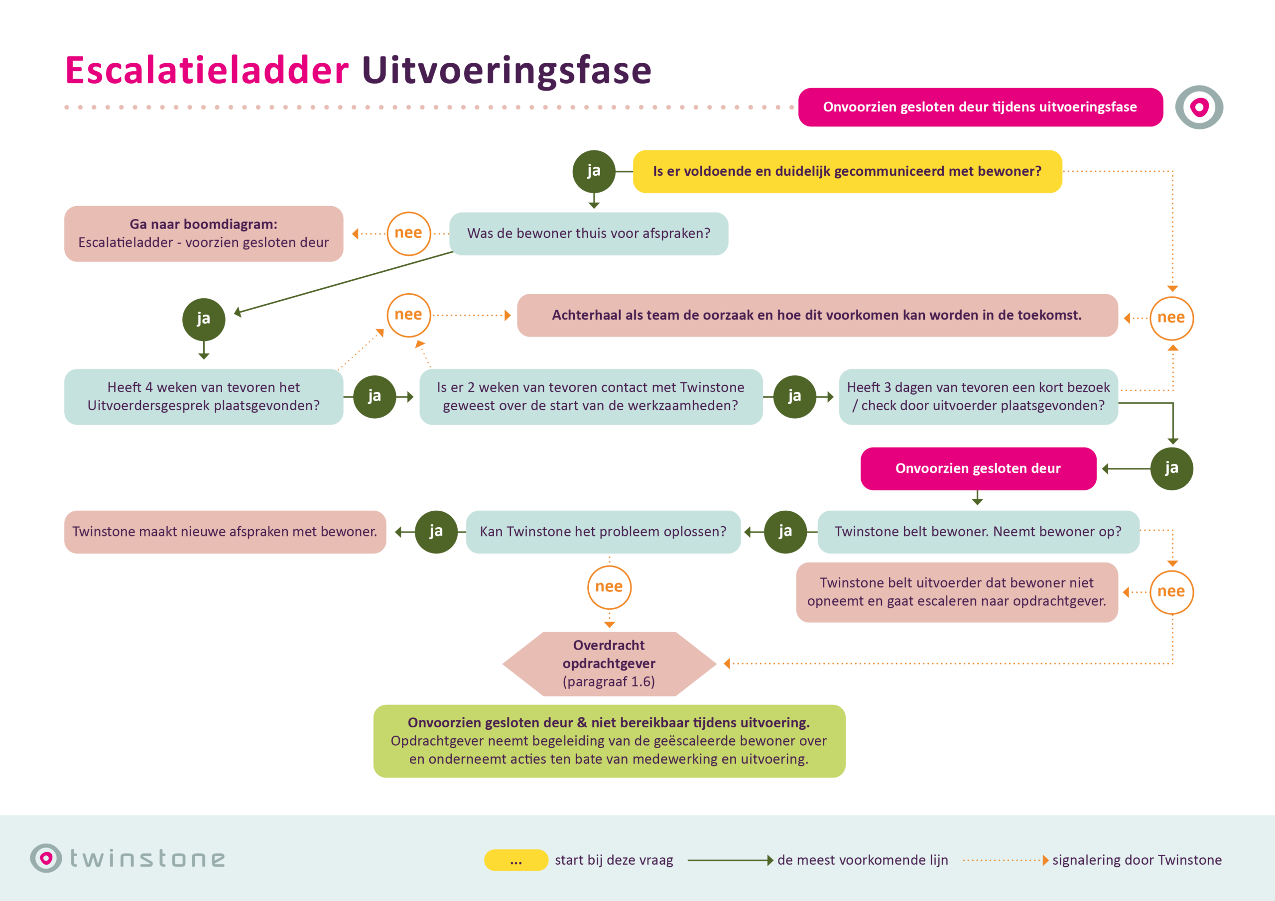 Corporatie aan zet: De woningcorporatie handelt vanuit haar eigen bevoegdheden en verantwoordelijkheden. Twinstone blijft beschikbaar voor afstemming.