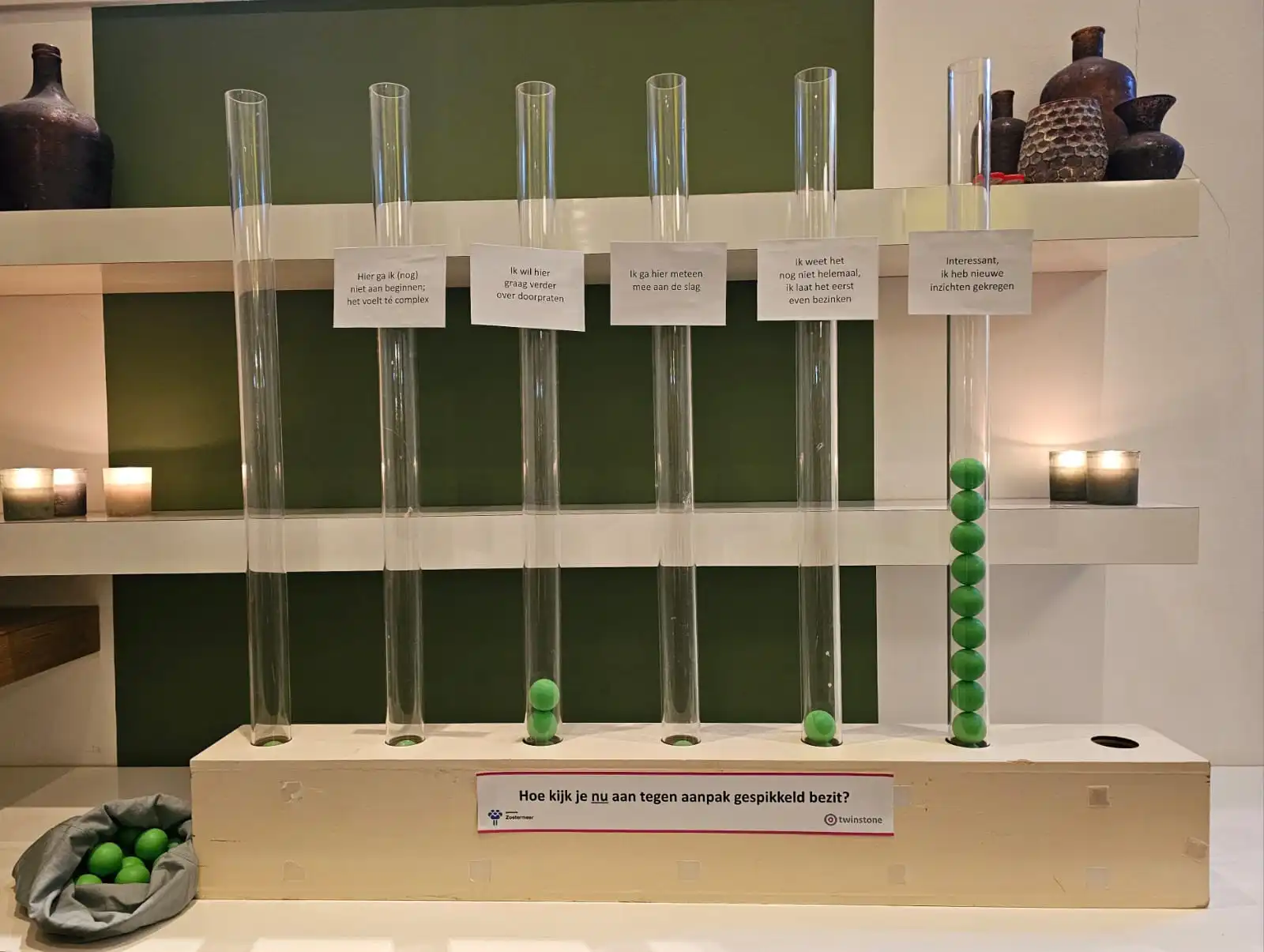 Onze Spreekbuis zetten wij in om de reactie op te halen van bewoners of bezoekers, bijvoorbeeld voor en ná Informatiebijeenkomsten, MeeDenkgroepen en Intervisiegroepen. De Spreekbuis bestaat uit verschillende verticale buizen. Elke buis vertegenwoordigt een ander antwoord of reactie op een belangrijke vraag. Balletje gooien? Door een balletje in de buis van het gewenste antwoord te laten vallen, kan men op een toegankelijke en interactieve manier hun stem laten horen. Handig om een presentatie of een sessie direct te beginnen met de peiling zodat je kan inspelen op het sentiment onder je publiek!