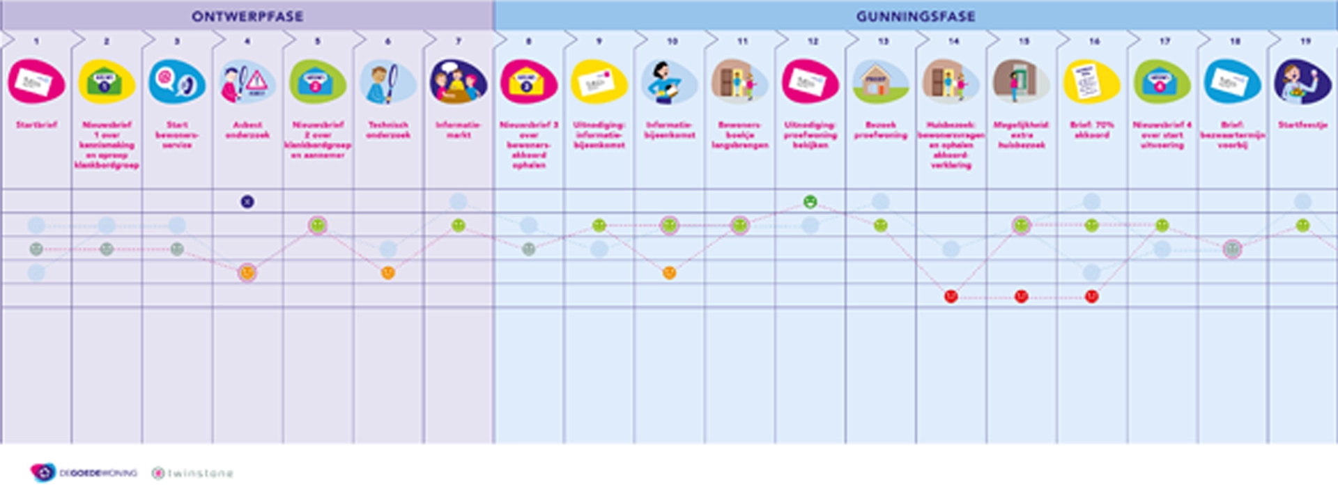 Tijdens verduurzamings- en renovatieprojecten wordt veel gevraagd van bewoners: overlast, keuzes maken, tijdelijke aanpassingen in hun woning en naderhand gedragsverandering. Dat vraagt om aandacht voor beleving. De Bewonersreis is een integrale en interactieve aanpak waarin we samen met bewoners én medewerkers de volledige ‘reis’ van de bewoner in kaart brengen. Een customer journey.