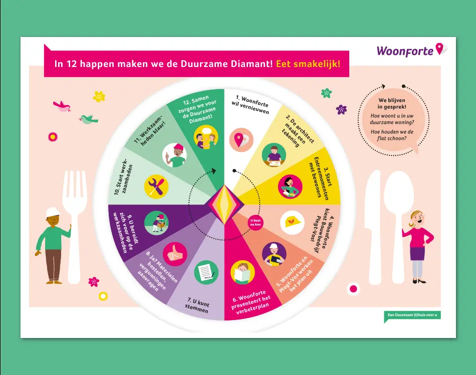 Samen eten verbindt, al helemaal als er een lekker ontbijt klaar staat in de entree van je flat. Op de placemat stond de planning met alle stappen te gaan in het project. Bewoners met haast kregen de placemat mee samen met een heerlijke koffie, croissant en appel. Andere bewoners snorden elkaar op en gingen uitgebreid samen ontbijten. Ondertussen lichtten wij de planning en stappen toe en luisterden naar hun reacties. Kinderen konden in de schoenen staan van de aannemer en kregen een kleurplaat van hun eigen flat. Stap voor stap verbinden, luisteren, vooruitkijken… De volgende keer een sport & spelmiddag, mede georganiseerd door deze bewoners zelf!