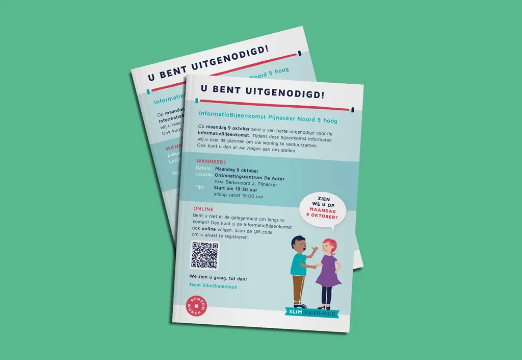 Na de werkzaamheden bleven we betrokken. Nieuwe installaties vragen om een andere manier van verwarmen en ventileren. Daarom ontwikkelden we de Slim en comfortabel wonen-waaier: een handige uitleg over hoe je zo energiezuinig mogelijk met je woning omgaat. Veel illustraties en korte heldere teksten. Zodra de werkzaamheden in een woning klaar waren, namen de tijd om deze waaier samen met de bewoner door te nemen.