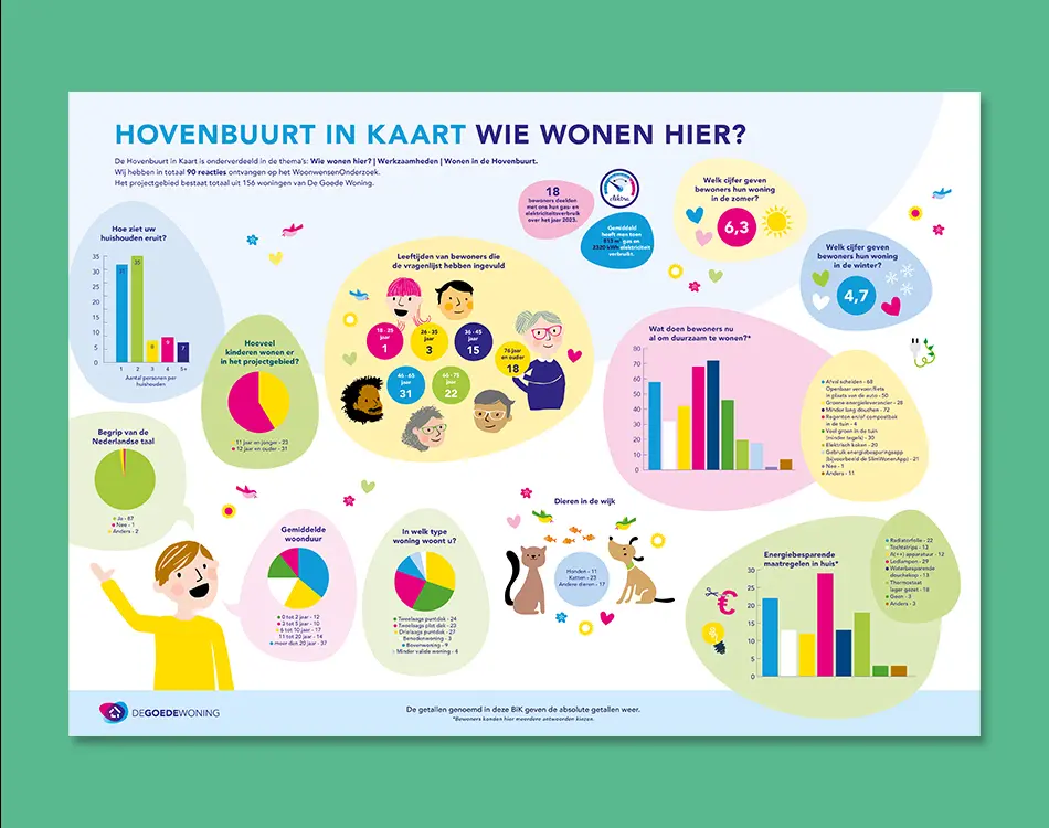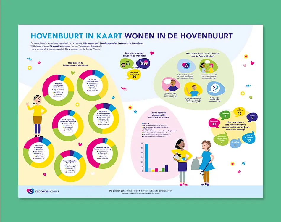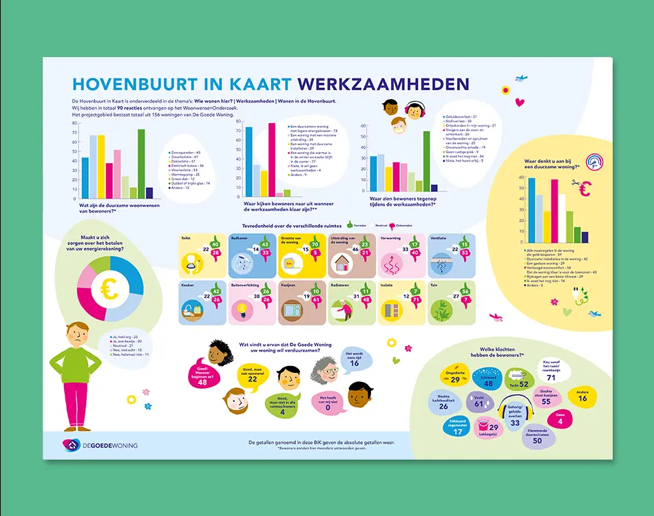 Een enorm aantal thematisch gebundelde ideeën, een groep betrokken bewoners (ook zij die eerder nauwelijks geïnteresseerd waren) en de HiK, oftewel de Hovenbuurt in Kaart. De HiK is geen taai rapport, maar een visuele, begrijpelijke samenvatting van de uitkomsten — voor bewoners én opdrachtgever. Zo maken we participatie tastbaar en waardevol voor iedereen.